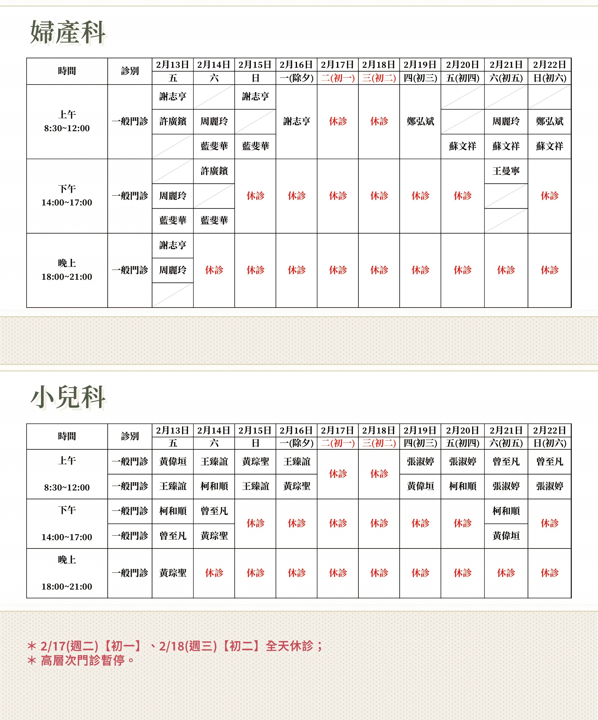 2026年春節門診表