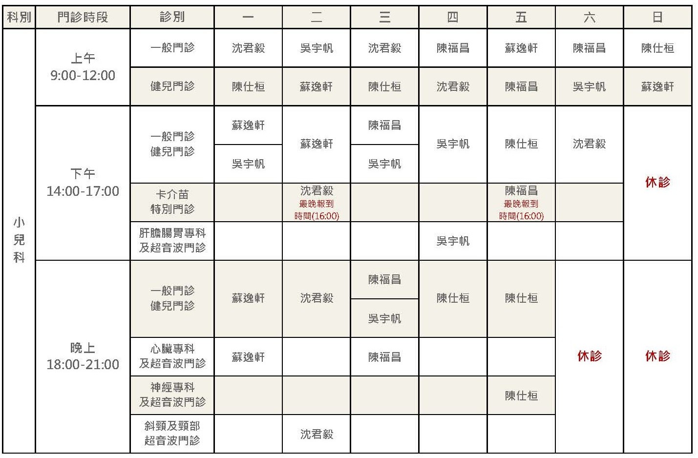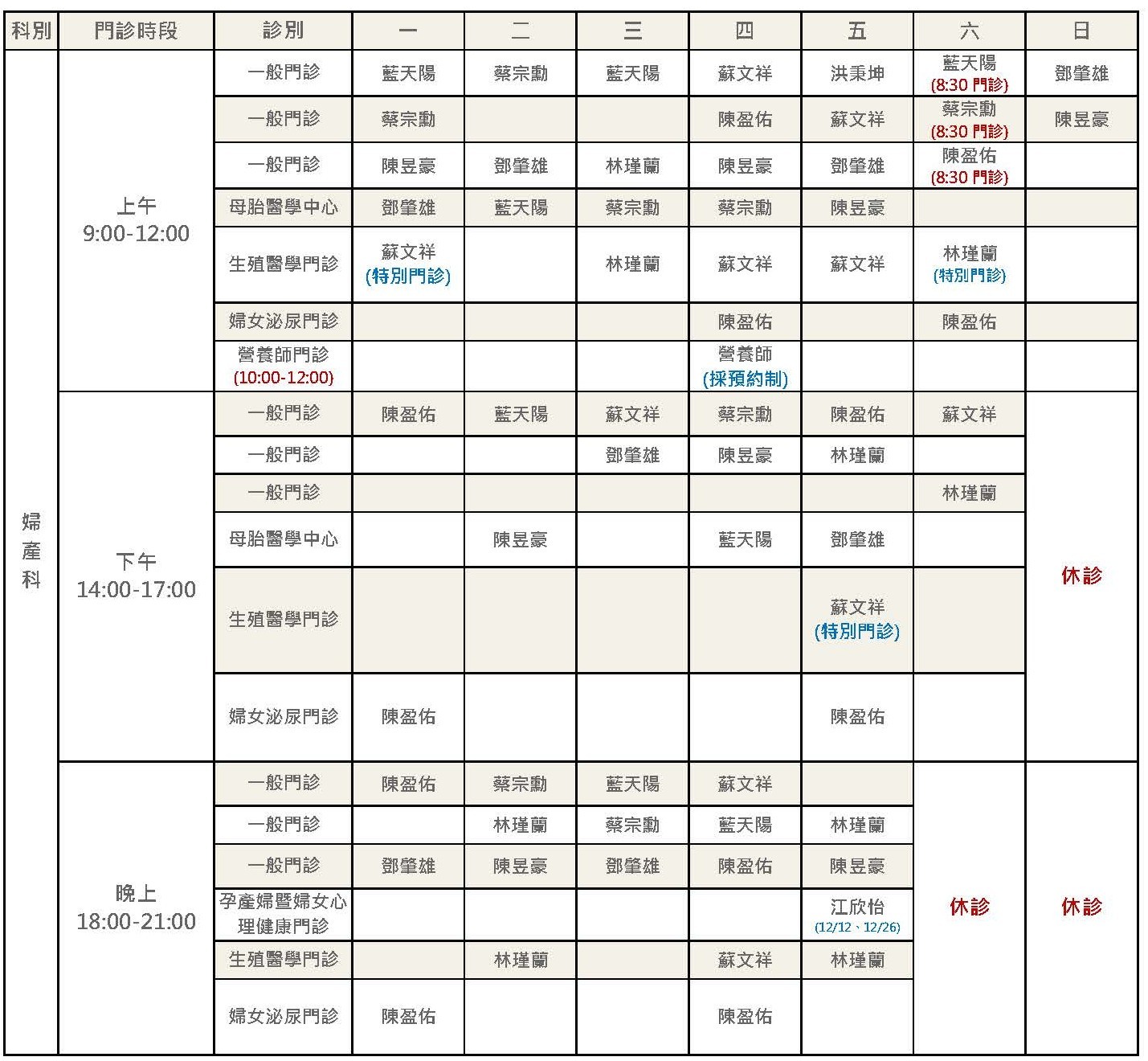 *各診報到時間最晚請於下列時間內完成報到手續: 【早診12:00前;午診17:00前;晚診20:30前(現場掛號) / 21:00前(預約掛號)】 *母胎醫學中心(高層次超音波及早期妊娠篩查)請先來電預約~預約電話:03-3709191#2111、2112 *羊膜穿刺限由醫師預約。 *本院開辦「孕產婦暨婦女心理健康門診」,特聘心理諮商師為有需要的媽咪提供專業諮詢喔! *萬美麗助產師門診採預約制,若有嚮往溫柔生產需求的媽咪,可以主動向櫃台預約喔! *產後護理之家預約參觀請洽:0972-295-112;官方Line ID:@205alcdb。 *卡介苗特別門診:每週二、五下午診,最晚請於16:00前至櫃檯報到。 *小兒科超音波服務增加週二晚上斜頸及頸部超音波門診。